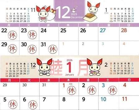 年末年始のお休みは、下記の通りです。 令和7年12月29日(月曜日)~ 令和8年1月3日(土曜日)までです。 新年は、1月4日(日曜)から営業しますが 翌日から(月・火曜日の為)2日間は、定休日ですのでお休みさせて頂きます。