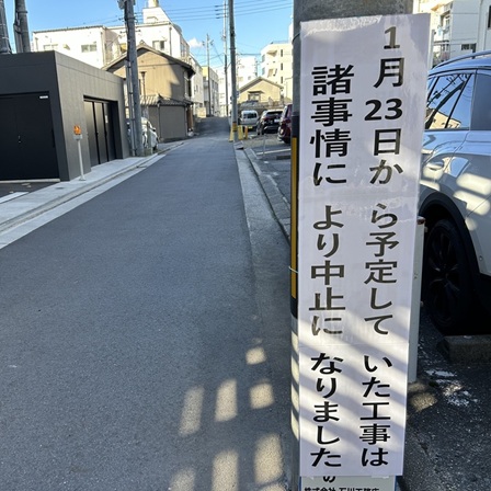“ジュエル足立”専用駐車場前の車道の下水工事が、中止になりました。